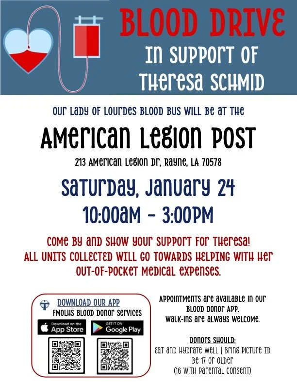They can stop by any Lourdes blood drive (just make sure to let the blood donor tech know they want the credit to go towards Theresa) or they can go to the Lourdes Blood Donor Center in Lafayette (4809 Ambassador Caffery Pkwy,